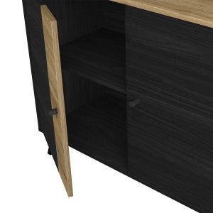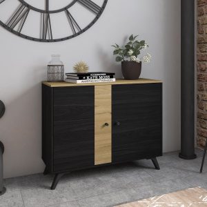 panneaux de particules et mélamine issus de bois FSC – Couleur : effet bois naturel et effet chêne noir – Rangements : 2 portes,Piètement en ABS noir – hauteur 12 cm – Dimensions totales : 92,1 x 40 x 81 cm – Conseils d’entretien : Nettoyer avec un chiffon sec – Fabriqué en Europe