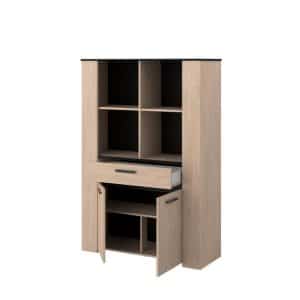 HELMA BAHUT HAUT, 4 niches en partie haute, 1 tiroir et 2 portes en partie basse avec 1 tablette, en panneau de particules revêtu papier décor Chêne, Dessus, derrière et bandeau décoratif décor Noir