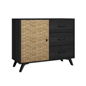 Meuble 1 Porte 3 Tiroirs Effet Bois Noir et Bambou Tressé