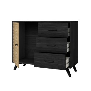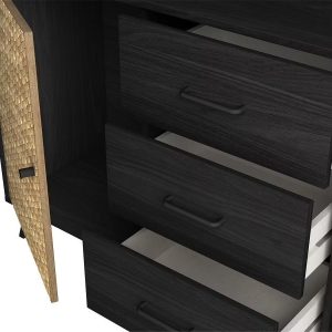 Un mélange original de style industriel et éthnique avec son motif tressé envoûtant. Dispose d’un grand espace de rangement fermé pour stocker linge, vaisselle et plus encore, et de 3 tiroirs pour une organisation parfaite !