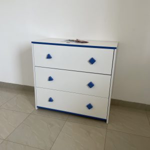 Meuble moderne de style minimaliste, principalement blanc avec des accents bleus. Elle est composée de trois tiroirs, chacun équipé de poignées de formes différentes : des carrés et des triangles bleus. La bordure supérieure et inférieure de la commode est également soulignée en bleu, ce qui lui donne un aspect élégant et adapté à une chambre d’enfant ou d’adolescent.