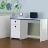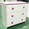 Meuble moderne de style minimaliste, principalement blanc avec des accents bleus. Elle est composée de trois tiroirs, chacun équipé de poignées de formes différentes : des carrés et des triangles bleus. La bordure supérieure et inférieure de la commode est également soulignée en bleu, ce qui lui donne un aspect élégant et adapté à une chambre d’enfant ou d’adolescent.
