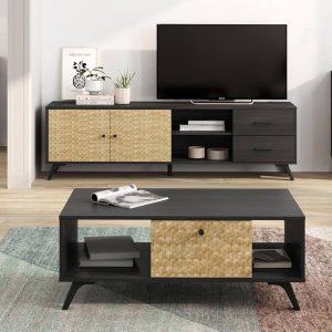 Parfait pour être associé à des meubles modernes dans un salon où vous souhaitez apporter une touche de chaleur, ce meuble audio/vidéo de grande dimension mise sur ses ouvrants et leur impression bois tressé en relief au design exclusif.