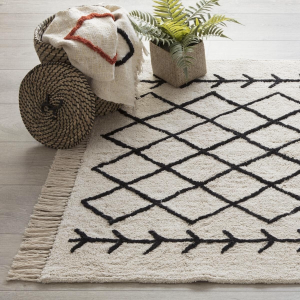 Avec ce tapis, optez pour des paniers en guise de rangement ou de porte revue.